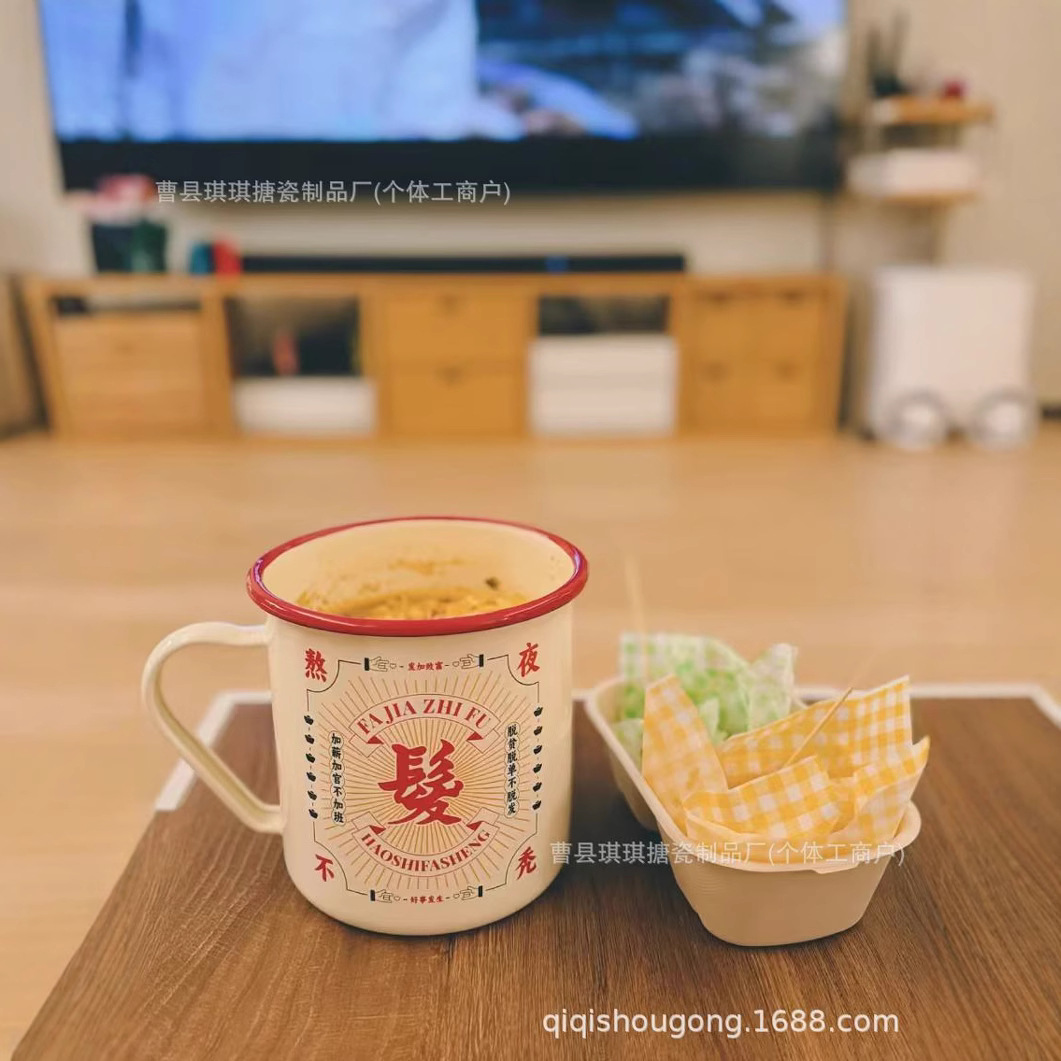 网红搪瓷快餐杯带盖学生创意泡面碗大容量便当盒老式饭缸印刷logo