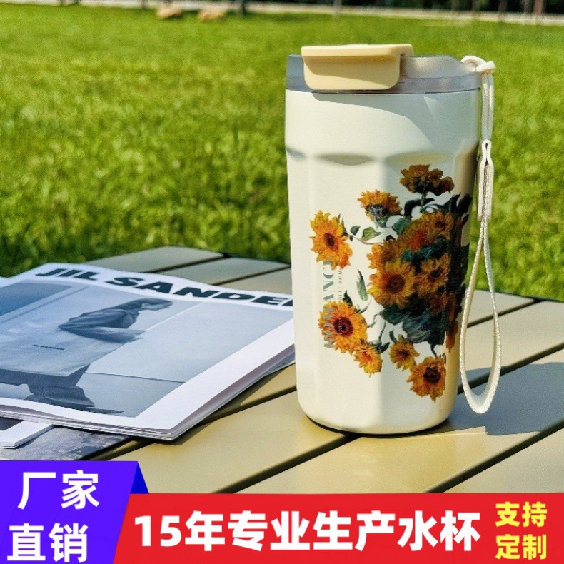 向日葵系列316不锈钢双饮带吸管便携提绳不锈钢保温杯咖啡杯