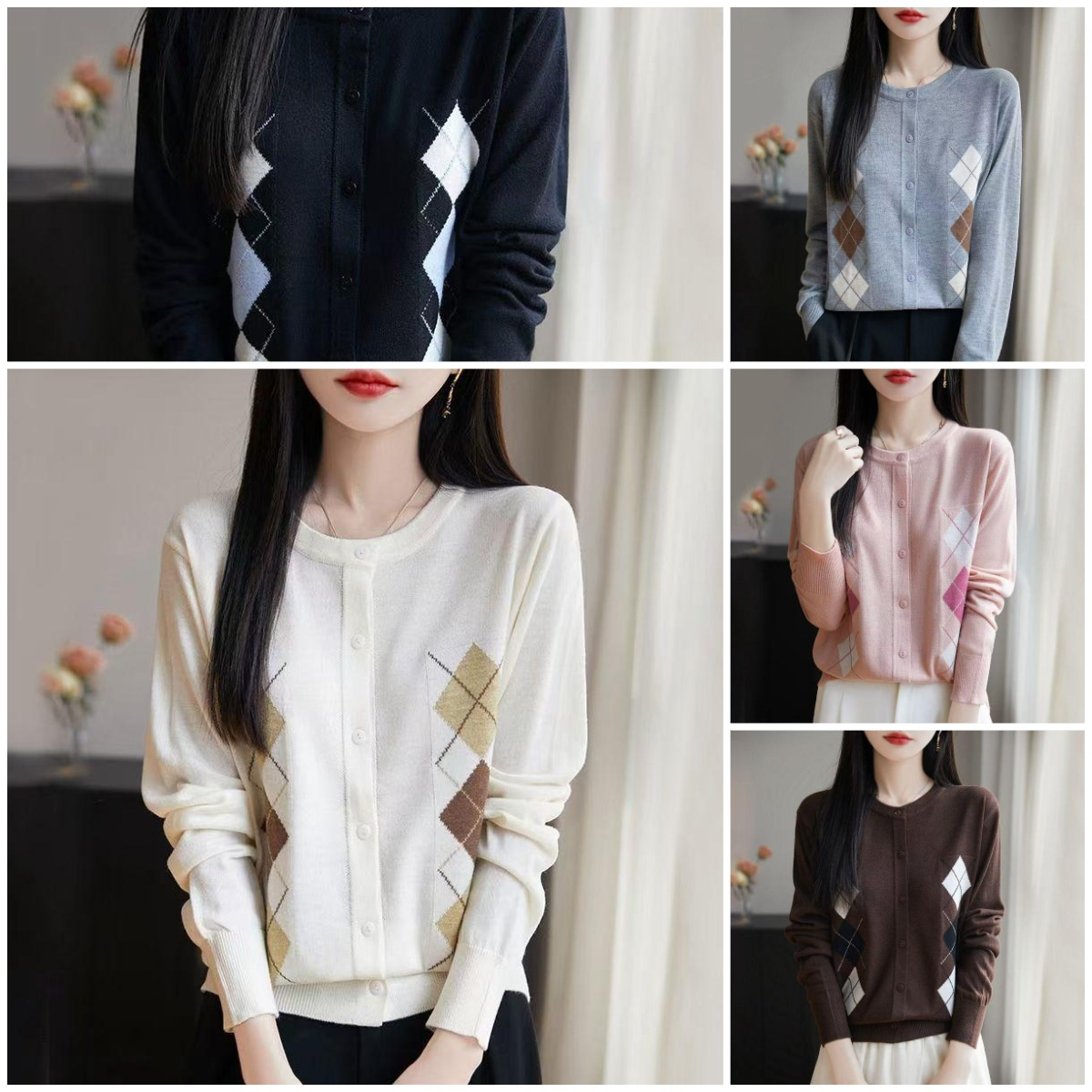 跨境女装外贸开衫针织外套菱形图案圆领气质通勤小众设计针织开衫