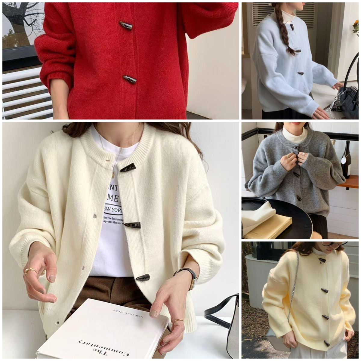 跨境女装外贸开衫针织外套高级感牛角扣圆领纯色韩系款式百搭外套