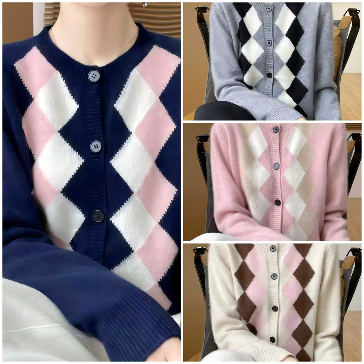 跨境女装外贸开衫针织外套菱形图案圆领复古拼色秋冬百搭外套上衣