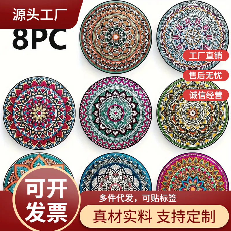 杯垫批发 亚马逊 吸水防滑黄杨木软木杯垫曼陀罗系列组合款热