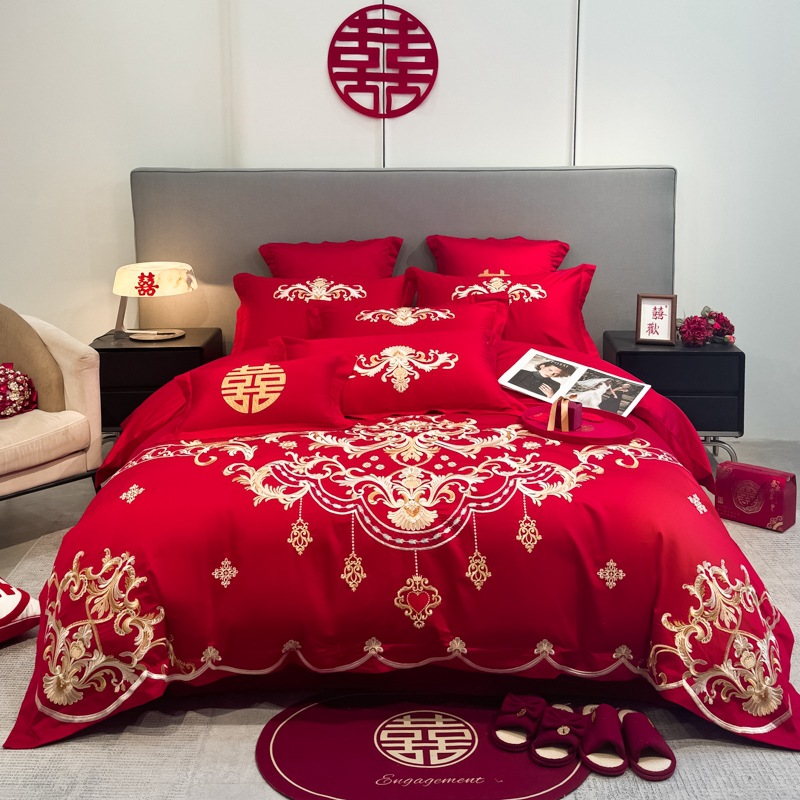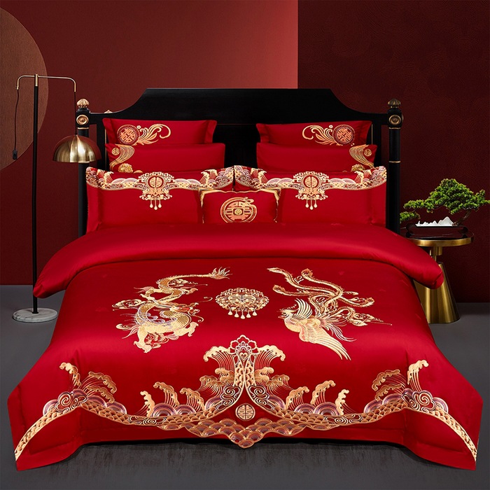 高端140支长绒棉婚庆四件套大红色龙凤纯棉刺绣全棉结婚床上用品