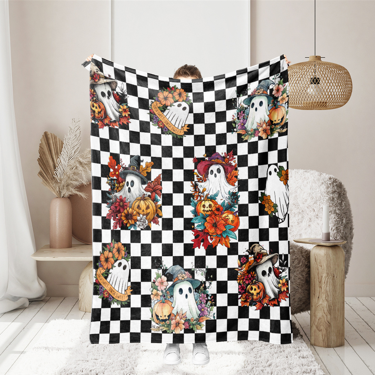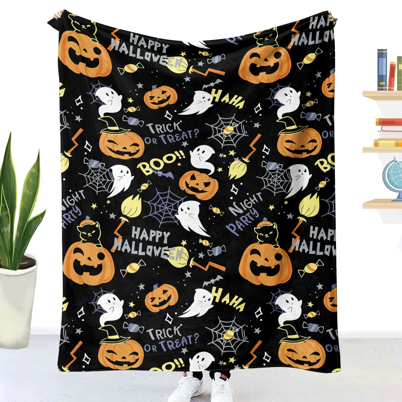 跨境法兰绒毛毯万圣节卡通幽灵节日氛围沙发毯盖毯午睡毯外贸货源