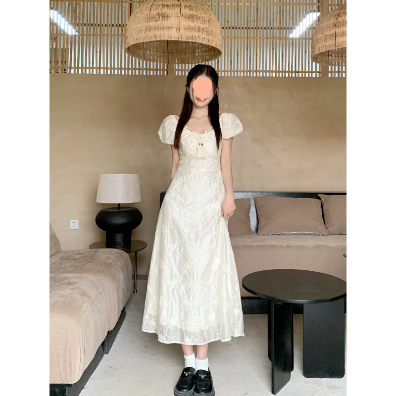 方领法式茶歇裙泡泡袖蕾丝宫廷小众短袖中长过膝显瘦连衣裙女甜美