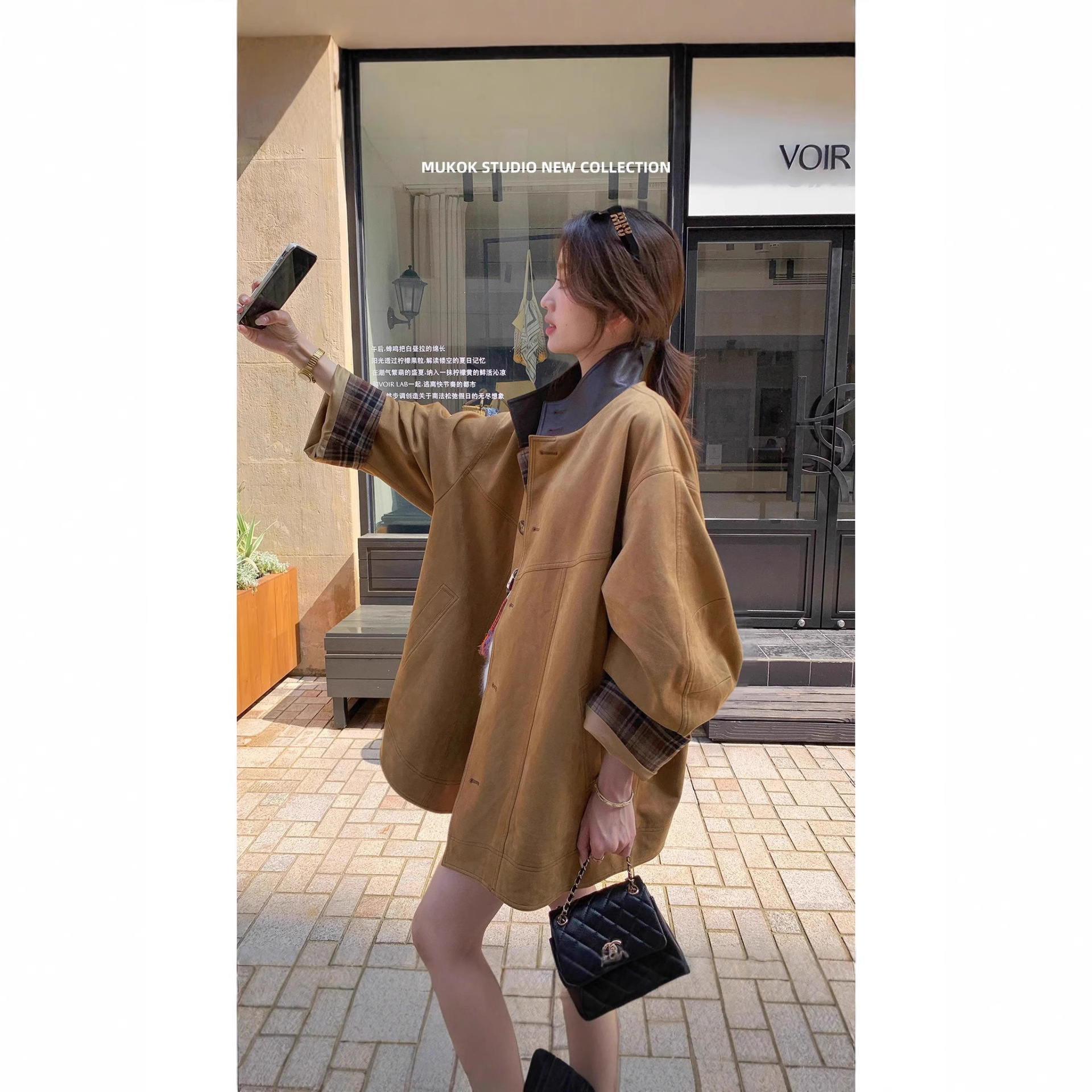 MUKOK MIU系巴恩风咖色立领撞色格纹麂皮绒分割设计夹克外套女秋