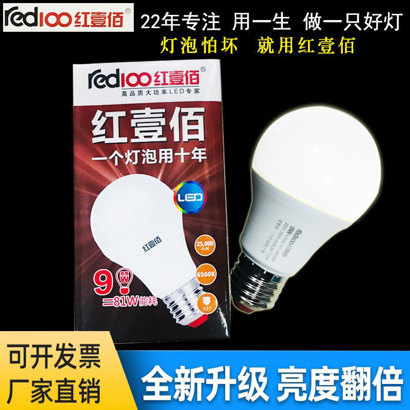红壹佰灯泡厂家现货耐用超亮光护眼无频闪节能灯厂房仓库led球泡