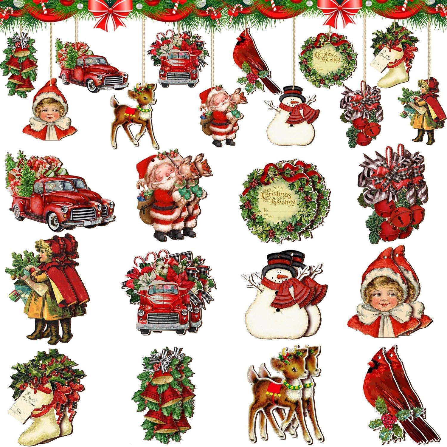 跨境新品20件套传统圣诞风格木质圣诞老人装饰品挂件圣诞树装饰品