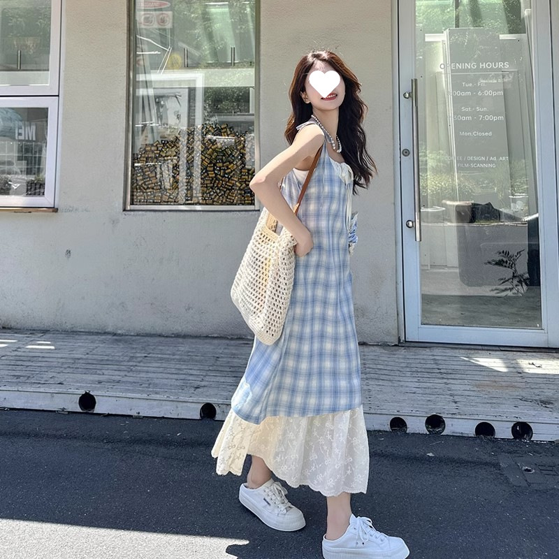 超好看少女蓝色格纹吊带裙连衣裙新款夏季假两件拼接蕾丝设计长裙