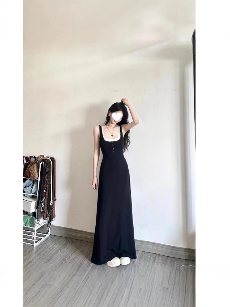 黑色长裙假两件赫本风小黑裙桔梗法式减龄显瘦吊带连衣裙子女夏装