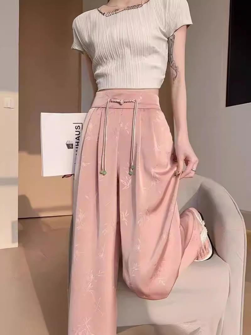 新中式国风盘扣阔腿裤女提花夏季新款薄款垂感冰丝拖地裤子女