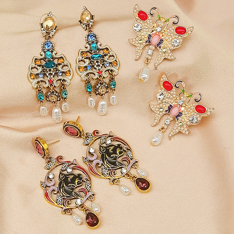 vintage中古风耳钉欧美气质时尚珐琅镂空珍珠耳坠耳饰跨境批发
