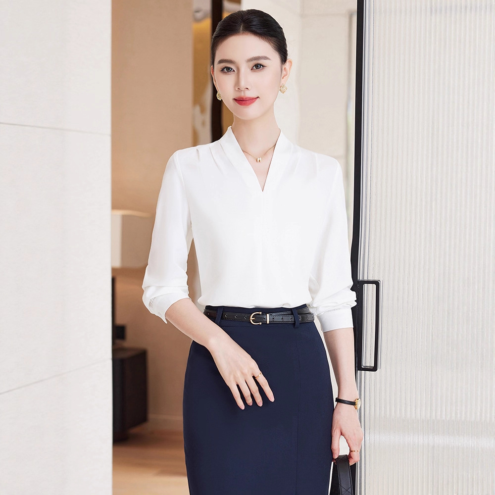 白色V领衬衫女秋季西装内搭长袖衬衣酒店前台接待工作服通勤工装