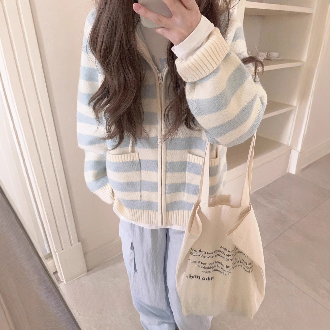 2025冬季新款宽松休闲连帽慵懒风毛衣外套上衣条纹拉链针织开衫女