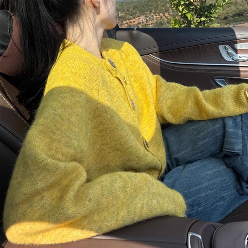 2025宽松慵懒风黄色针织开衫女春秋圆领毛衣外套休闲百搭
