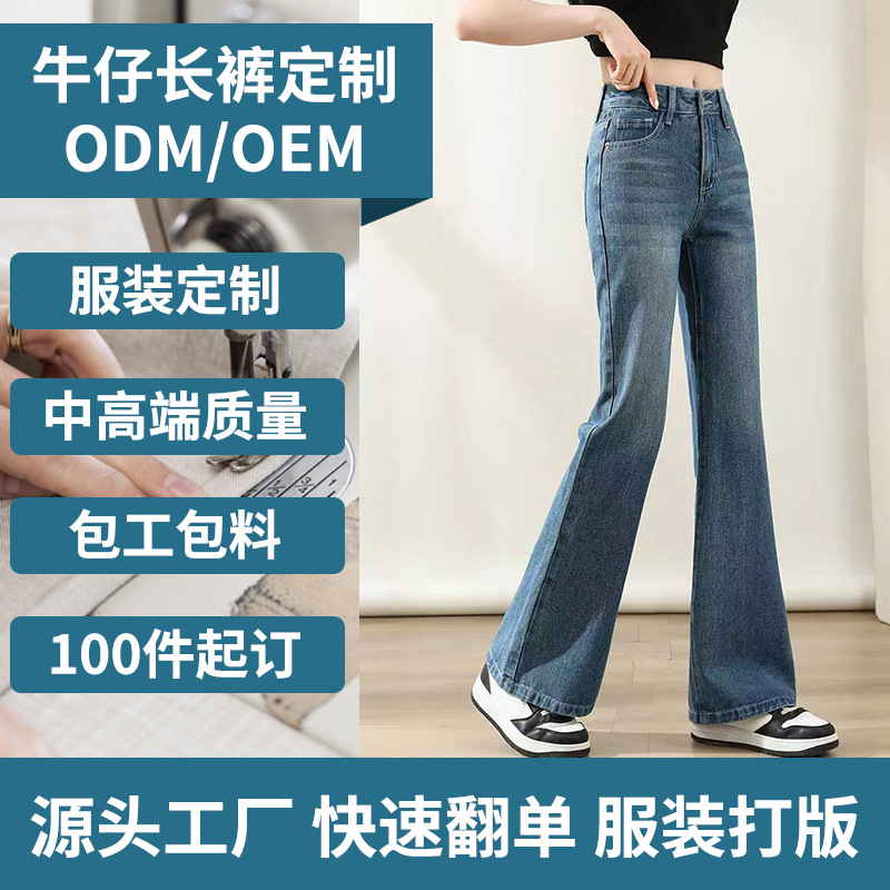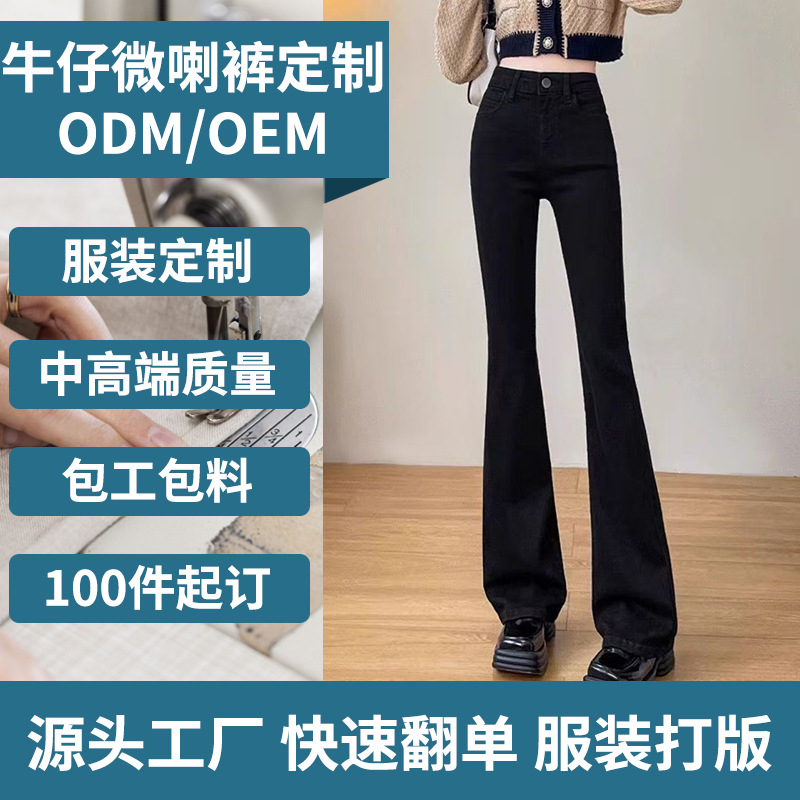 牛仔裤女夏季休闲黑色微叭裤高腰双扣显瘦长裤喇叭裤服装工厂定制