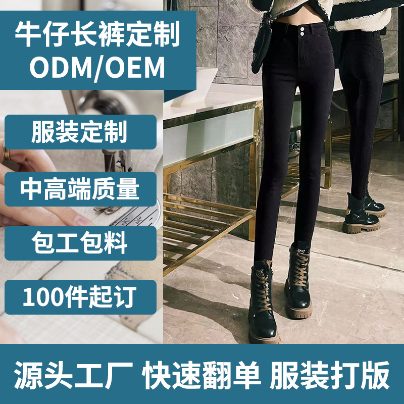 工厂直供牛仔裤女黑色紧身弹力高腰拉链牛仔铅笔裤机车风小脚长裤