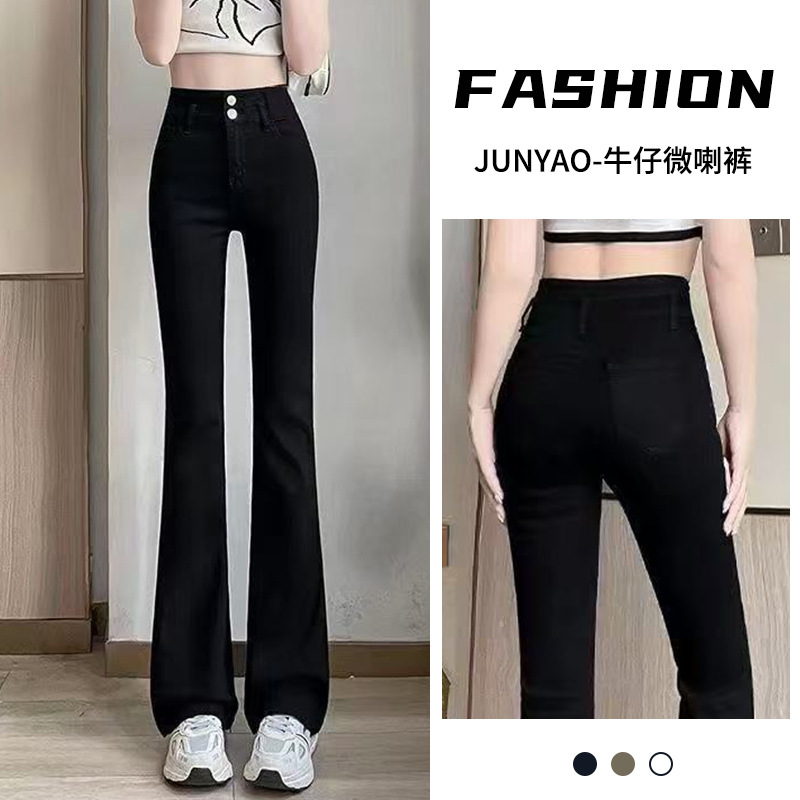 黑色双扣微喇裤牛仔裤休闲高腰弹力时尚长裤显瘦喇叭牛仔裤女批发