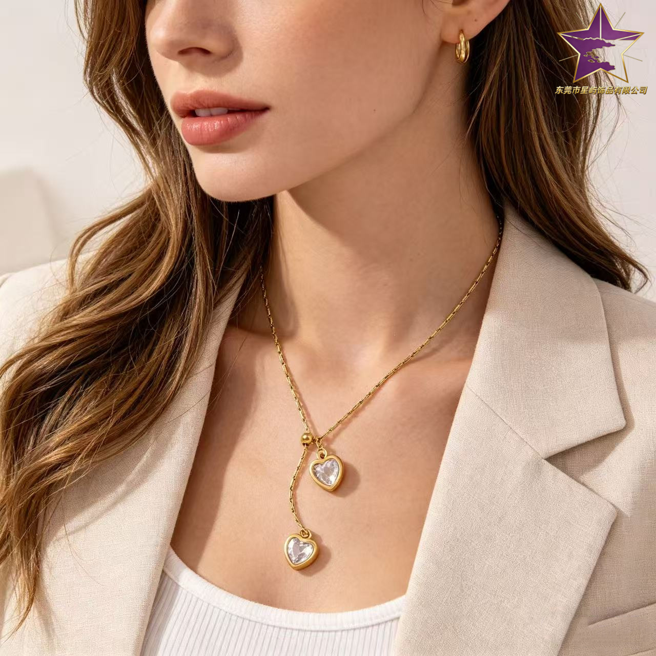 星屿跨境热销款不锈钢锆石双心形轻奢小众吊坠女士项链不掉色饰品