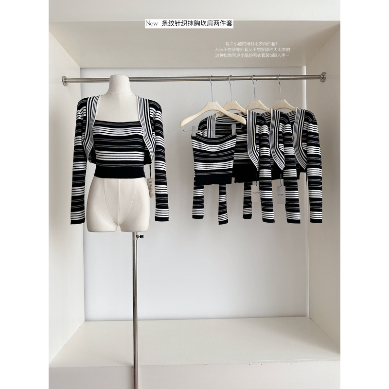 心动波尔卡 复古条纹针织抹胸短上衣长袖毛衣坎肩两件套