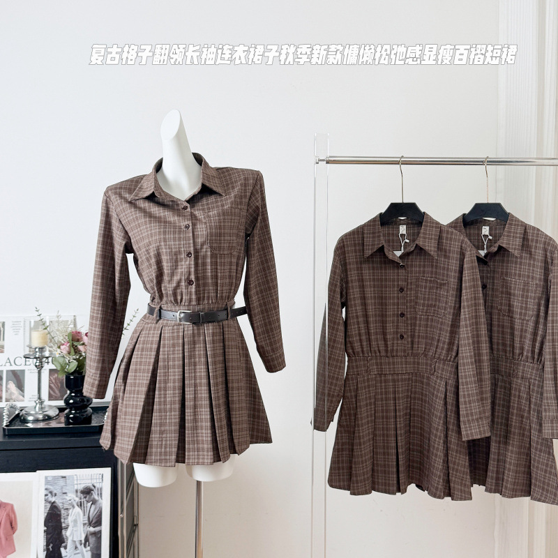 欧货复古格子长袖衬衫连衣裙女早秋新款宽松收腰设计感百褶短裙子