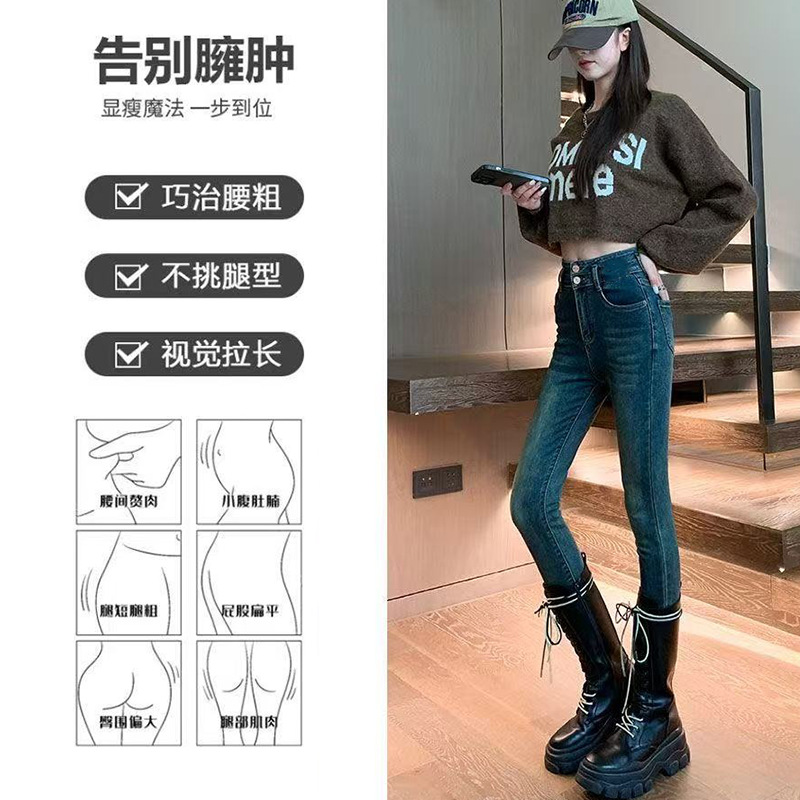 浅蓝色高腰牛仔裤女春秋薄款修身显瘦小脚裤铅笔裤牛仔长裤批发