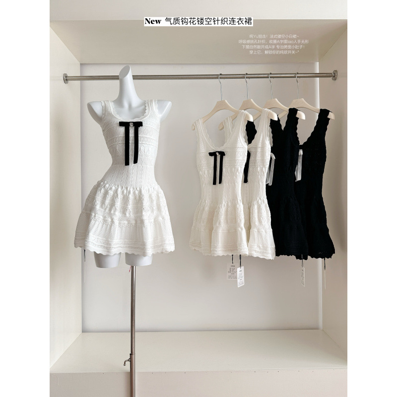 白色吊带连衣裙夏季精致千金蝴蝶结钩花镂空针织背心裙