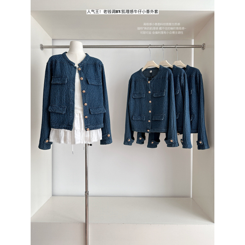 小众肌理感牛仔小香外套型立领夹克搭甜美蓬蓬白色半身裙两件套
