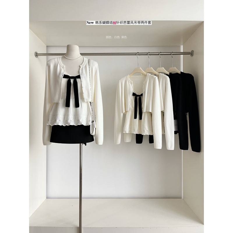 2025新芭蕾风韩系套装女长袖针织开衫秋冬内搭蝴蝶结吊带两件套
