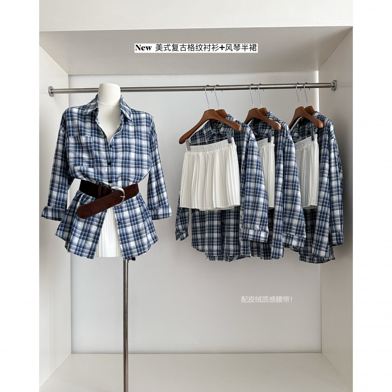 春夏出行穿搭复古格纹长袖衬衫上衣女高腰百褶半身裙皮带三件套装