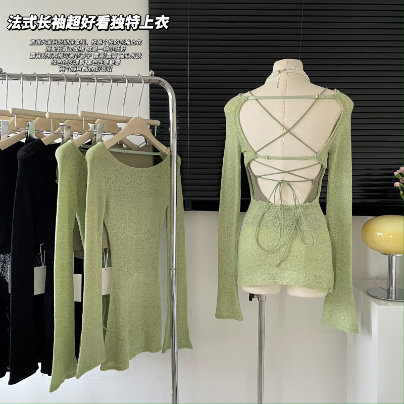 红人馆绿色针织衫修身法式长袖女2023新款内搭高级独特美背超好看