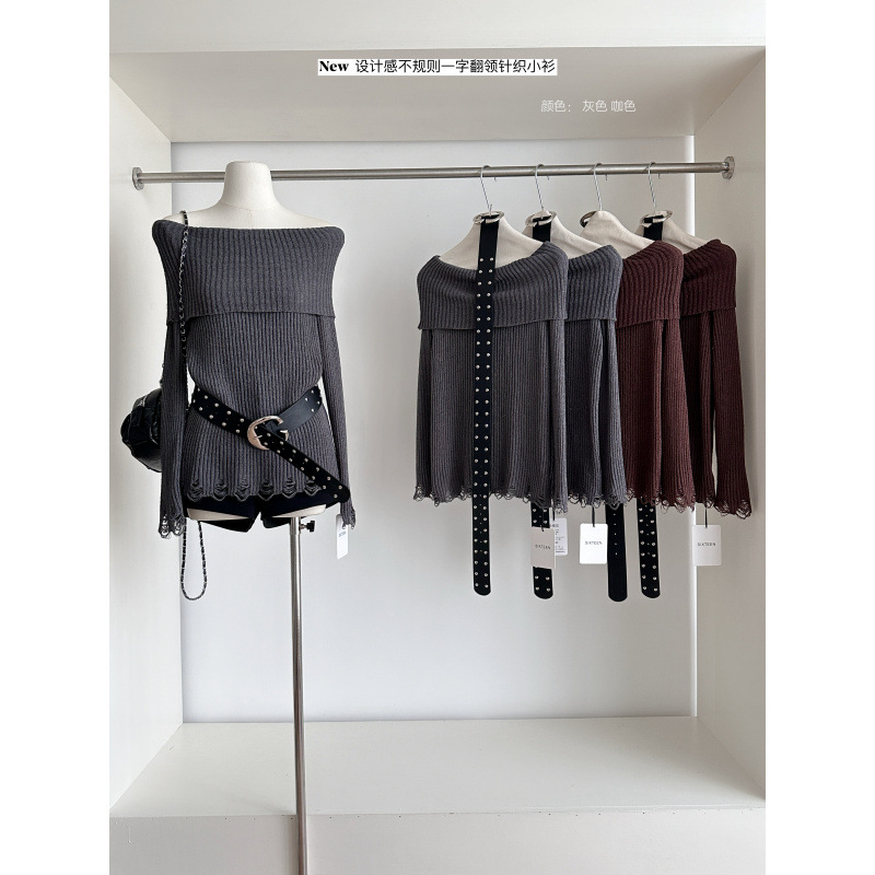 2025新款性感一字肩针织连衣裙初秋纯欲风腰带款女毛衣