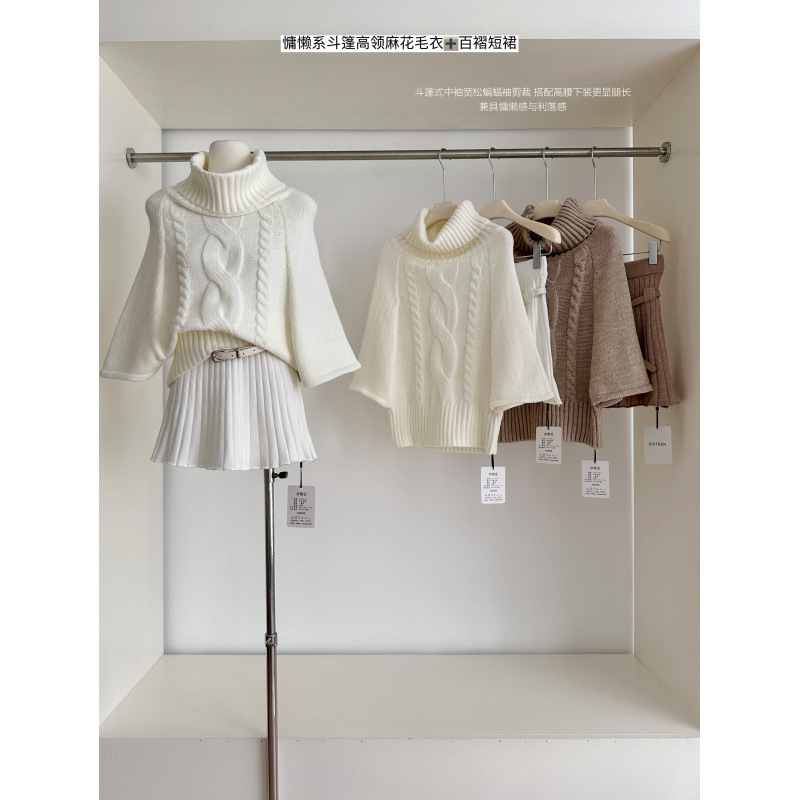 2025斗篷高领麻花外穿针织毛衣外套搭皮带百褶短款高腰半身裙套装