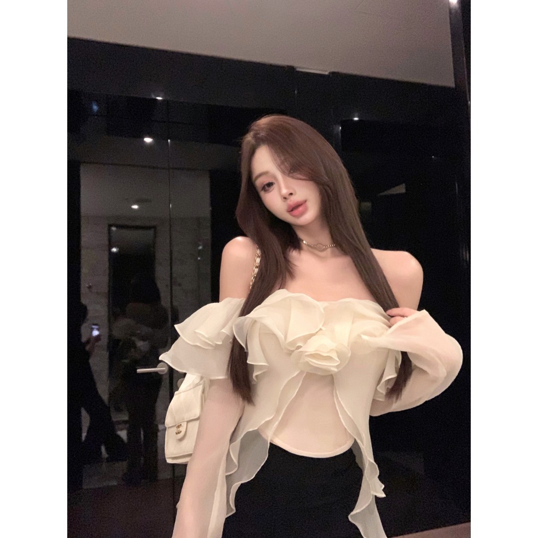 2025新款纯欲风一字肩荷叶边长袖衬衫女秋季新款减龄chic显瘦上衣