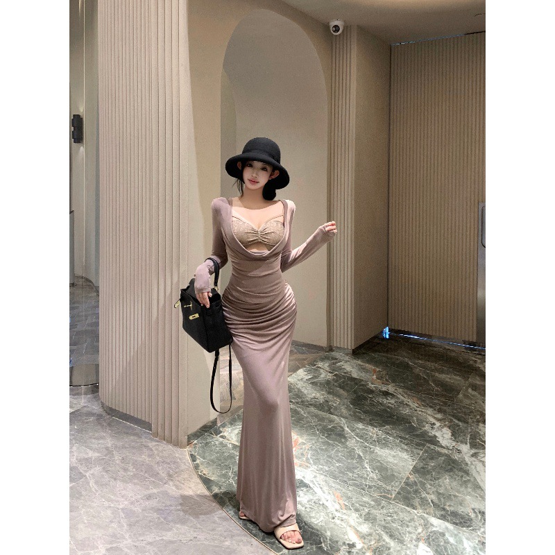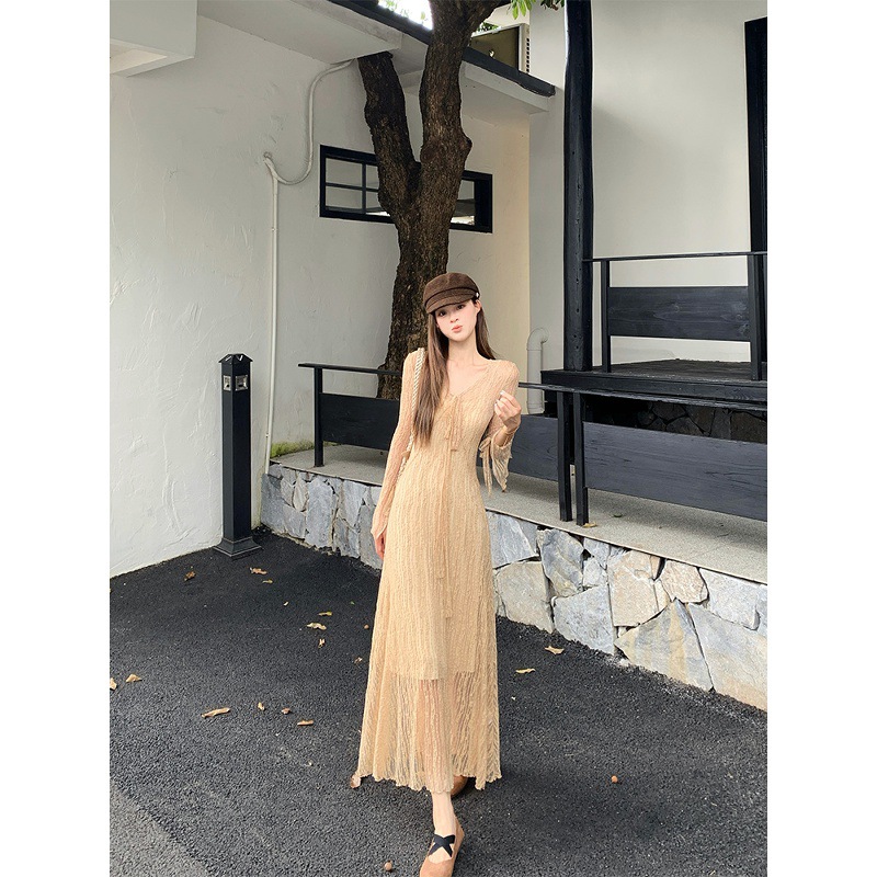 2025新款温柔风设计系带蕾丝长袖连衣裙女早秋收腰显瘦卡其色长裙