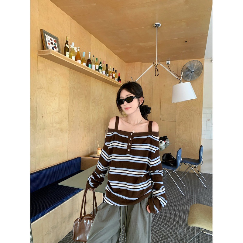 2025新款复古条纹一字领长袖针织衫女装秋季小众别致宽松露肩上衣