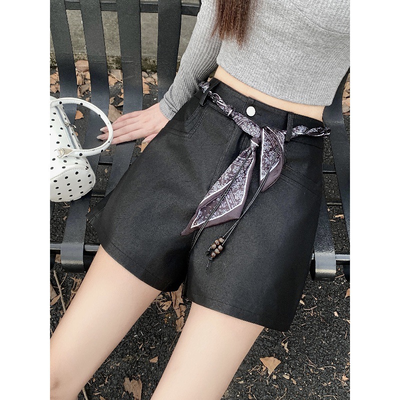 2025新款美拉德咖啡色PU皮高腰休闲裤女装秋季百搭宽松直筒裤短裤