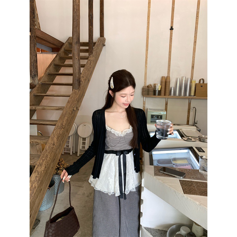 2025新款设计感黑色长袖开衫内搭吊带背心女秋季格子休闲裤三件套