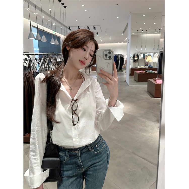 2025新款气质套装高级感白色长袖衬衫女秋季高腰显瘦牛仔裤两件套