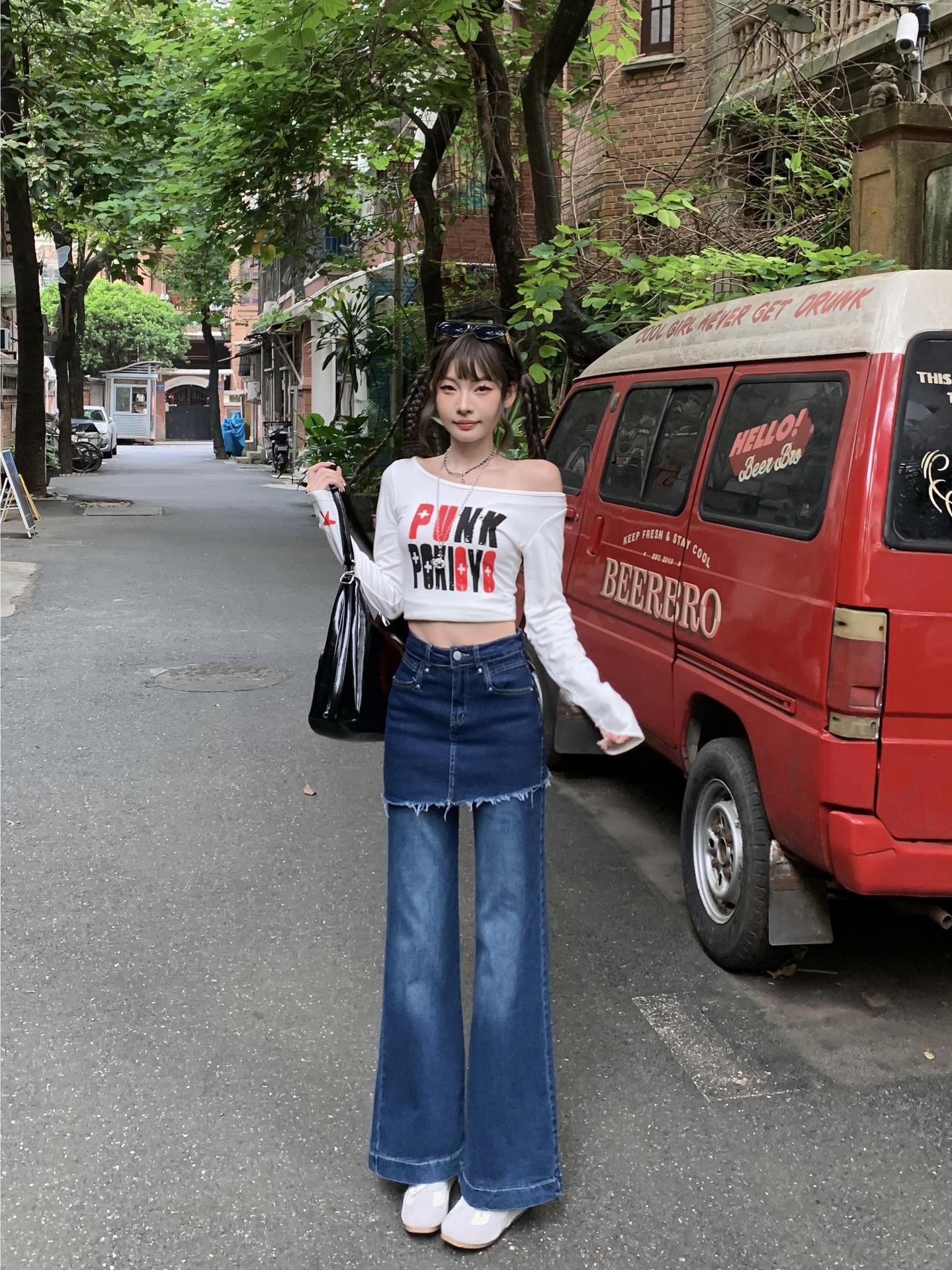2025新款秋装韩系假两件高腰宽松不贴腿显瘦休闲微喇牛仔裤拖地女