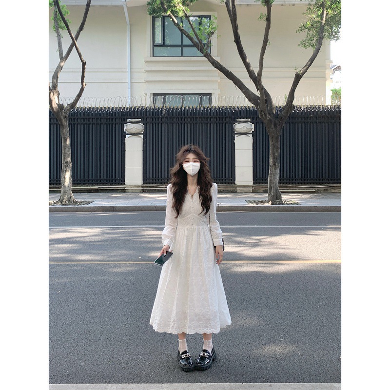 2025新款法式气质白色提花长袖连衣裙女秋季新款显瘦减龄chic长裙
