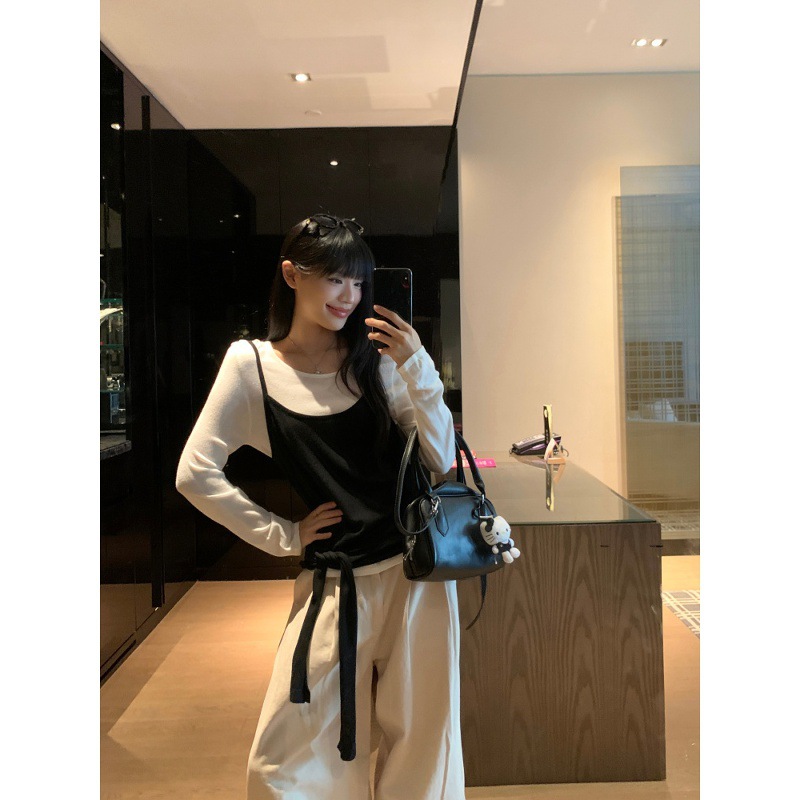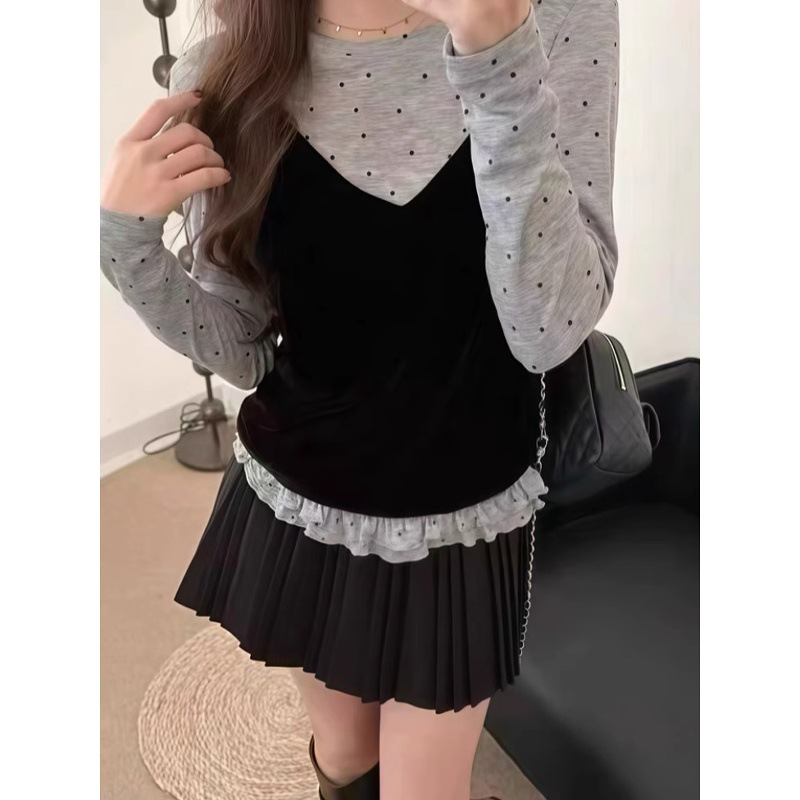 2025新款甜美风圆领波点荷叶边长袖T恤女秋季叠穿背心吊带两件套