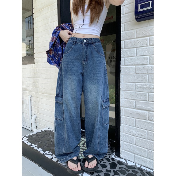 2025新款美式做旧蓝色牛仔裤工装裤女装秋季垂感宽松阔腿裤拖地裤