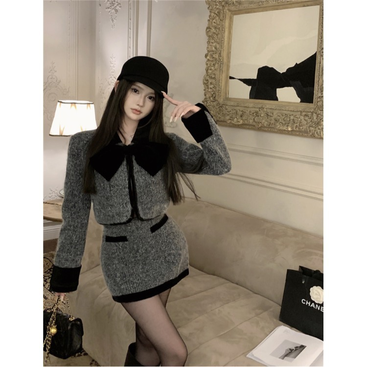 2025新款气质套装撞色蝴蝶结毛呢外套女秋季高腰包臀半身裙两件套