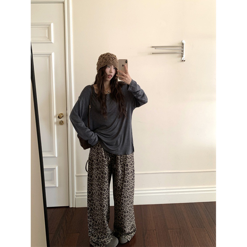 2025新款慵懒风套装宽松显瘦长袖T恤女秋季复古豹纹阔腿裤两件套