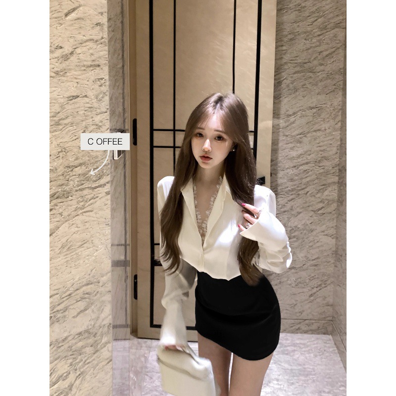 2025新款纯欲风套装V领蕾丝花边衬衫女秋季显瘦高腰半身裙两件套