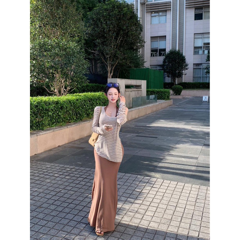 2025新款纯欲套装条纹不规则长袖T恤女秋季叠穿挂脖连衣裙两件套