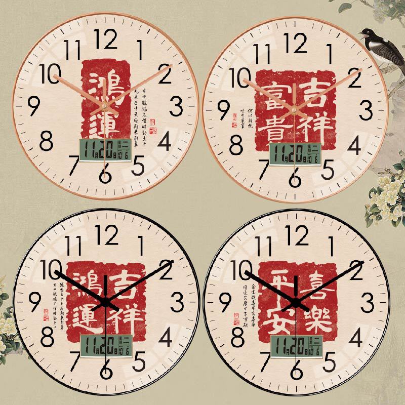12英寸静音挂钟家用扫秒石英钟显示日历温度挂墙中式书法字体