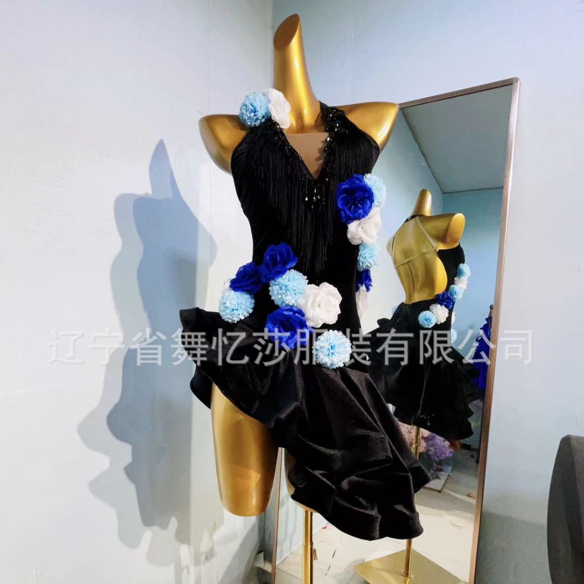 拉丁舞裙无袖立体花朵拉丁舞鱼尾裙摆演出服比赛拉丁舞艺考花服