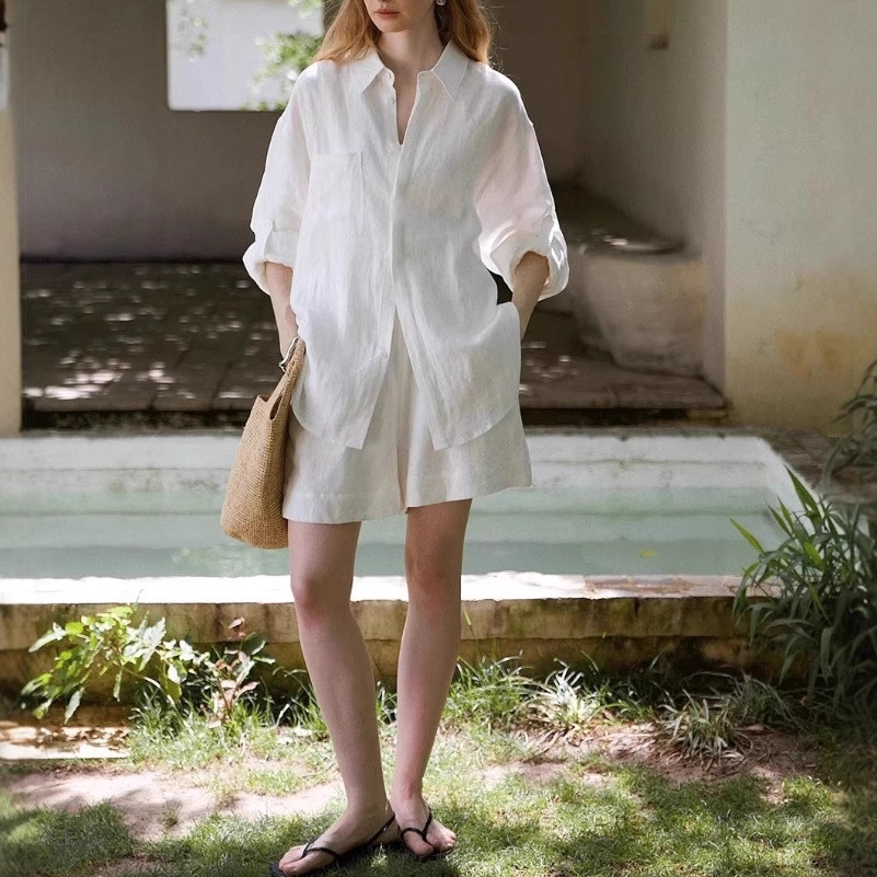 白色老钱风亚麻长袖衬衫女夏薄款轻奢感棉麻衬衣短裤防晒套装